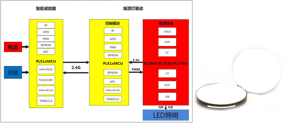 节能绿色环保越来越受消费者重视, LED作为新的照明产品,满足现今消费者需求,而LED智能照明也成为家居日常不可或缺产品,使用PL51WT020设计的吸顶灯方案,实现灯光的亮度、颜色、定时关灯等功能无线控制,遥控器做成随意贴方式,可以安装在家居环境内任意位置,不受方向障碍物等影响控制效果。